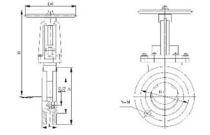 五、手動刀單裌(jia)式型閘閥(fa)的(de)構(gou)造圖及主要外形(xing)及連接尺寸(mm)